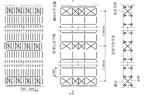 垂直支撐位于上、下弦橫向水平支撐同一開間內(nèi),形成一個(gè)跨長為屋架間距的平行弦桁架。它的上、下弦桿分別為上、下弦橫向水平支撐的豎桿,它的端豎桿就是屋架的豎桿(或斜腹桿)。垂直支撐中央腹桿的形式由支撐桁架的高跨比決定,一般常采用W形或雙節(jié)間交叉斜桿等形式。腹桿截面可采用單角鋼或雙角鋼T形截面。