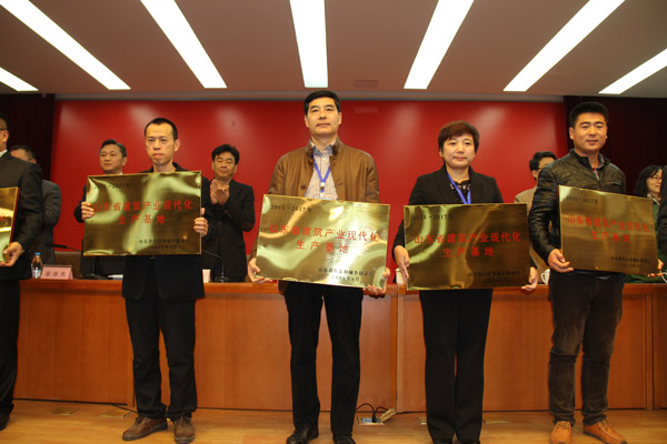 會(huì)上,宣布了2015年度全省建筑產(chǎn)業(yè)現(xiàn)代化試點(diǎn)城市、生產(chǎn)基地、試點(diǎn)工程項(xiàng)目,濟(jì)南市建委、榮成市政府作了交流發(fā)言,李興軍副廳長(zhǎng)作了重要講話。經(jīng)典集團(tuán)被授予為山東省建筑產(chǎn)業(yè)現(xiàn)代化生產(chǎn)基地,李興軍副廳長(zhǎng)為苗樹(shù)文董事長(zhǎng)授牌。