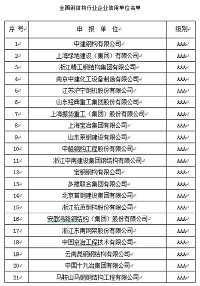 AAA信用評(píng)選由國(guó)家商務(wù)部、國(guó)資委、國(guó)家鋼結(jié)構(gòu)專家委員會(huì)面向全國(guó)3500余家鋼結(jié)構(gòu)制造、設(shè)計(jì)、建筑企業(yè),經(jīng)過層層選拔、資格初審復(fù)審、專家集中評(píng)審及面向社會(huì)公示后,中建鋼構(gòu)、上海綠地集團(tuán)、上海寶冶、杭蕭鋼構(gòu)、首鋼集團(tuán)、寶鋼集團(tuán)、振華重工等21家國(guó)有大型企業(yè)被評(píng)定為首批全國(guó)鋼結(jié)構(gòu)行業(yè)AAA級(jí)信用企業(yè),山東經(jīng)典重工集團(tuán)股份有限公司成為唯一獲此殊榮的山東省民營(yíng)企業(yè)。