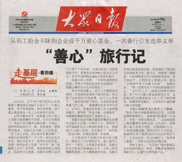 4月12日,位于濟(jì)寧兗州區(qū)的山東經(jīng)典重工集團(tuán)拿出1000萬(wàn)成立了一個(gè)愛心基金,用于扶困助殘、助學(xué)治病等。這個(gè)愛心基金是由一位工人的善行義舉引發(fā)的。