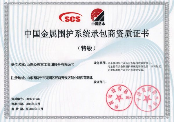 經(jīng)典集團(tuán)喜獲中國金屬圍護(hù)系統(tǒng)承包特級(jí)資質(zhì)