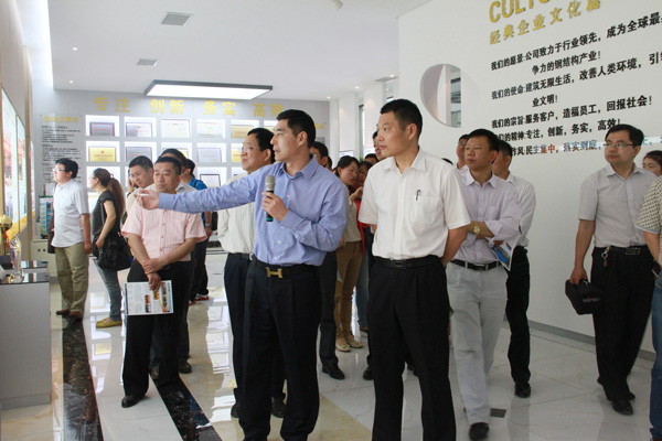 考察團一行參觀了經(jīng)典集團的文化館、項目中心、綜合辦公室、營銷中心和生產(chǎn)車間。苗樹文董事長向考察團介紹了經(jīng)典集團的生產(chǎn)經(jīng)營、項目建設(shè)、產(chǎn)學(xué)研合作、技術(shù)創(chuàng)新等情況。隨后,考察團一行實地參觀了經(jīng)典集團職工培訓(xùn)室、閱覽室、乒乓球室、臺球室、愛心超市和宴會廳,進一步了解了企業(yè)的文化建設(shè)有關(guān)情況。