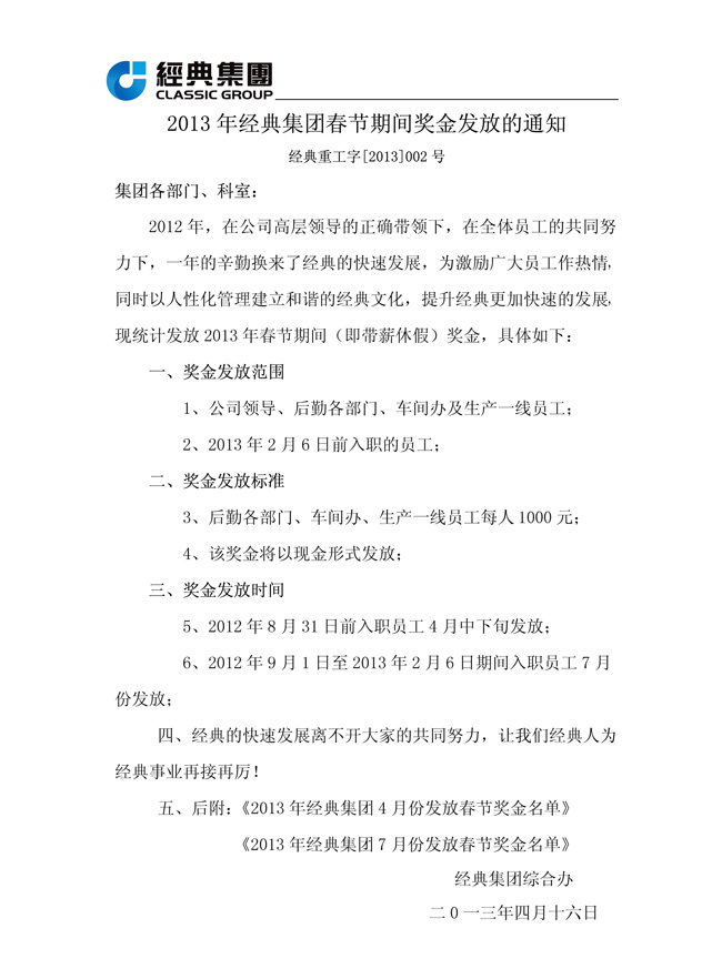 2013年經(jīng)典集團(tuán)春節(jié)期間獎(jiǎng)金發(fā)放的通知