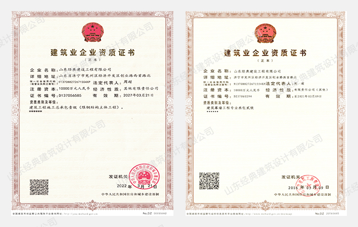 山東經(jīng)典建設(shè)工程有限公司始建于2001年,經(jīng)典集團全資子公司。位于古九州之一的兗州境內(nèi),在傳承中華民族傳統(tǒng)建筑工藝的基礎(chǔ)上經(jīng)過不斷的創(chuàng)新發(fā)展,公司現(xiàn)已具備承建現(xiàn)代城市綜合建設(shè)、公用設(shè)施、大型鋼結(jié)構(gòu)工業(yè)廠房、鋼框架結(jié)構(gòu)辦公、商務(wù)、住宅等多種工程的承建能力。